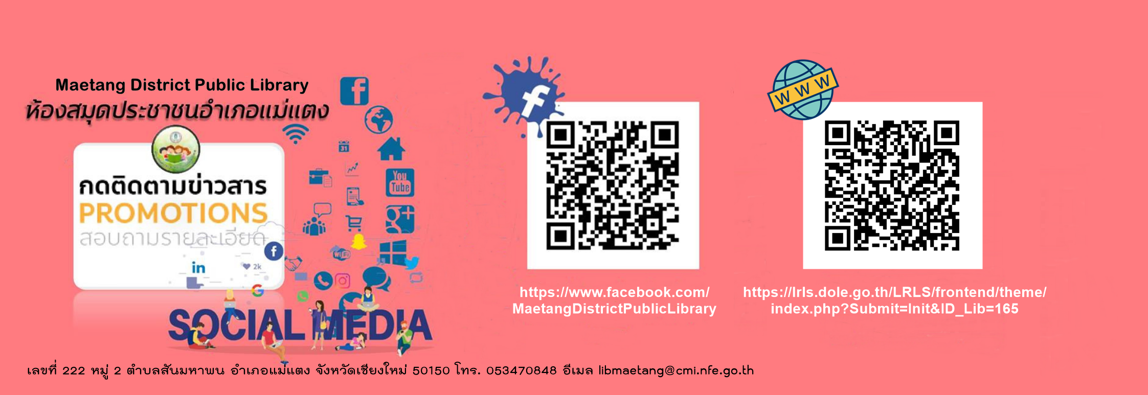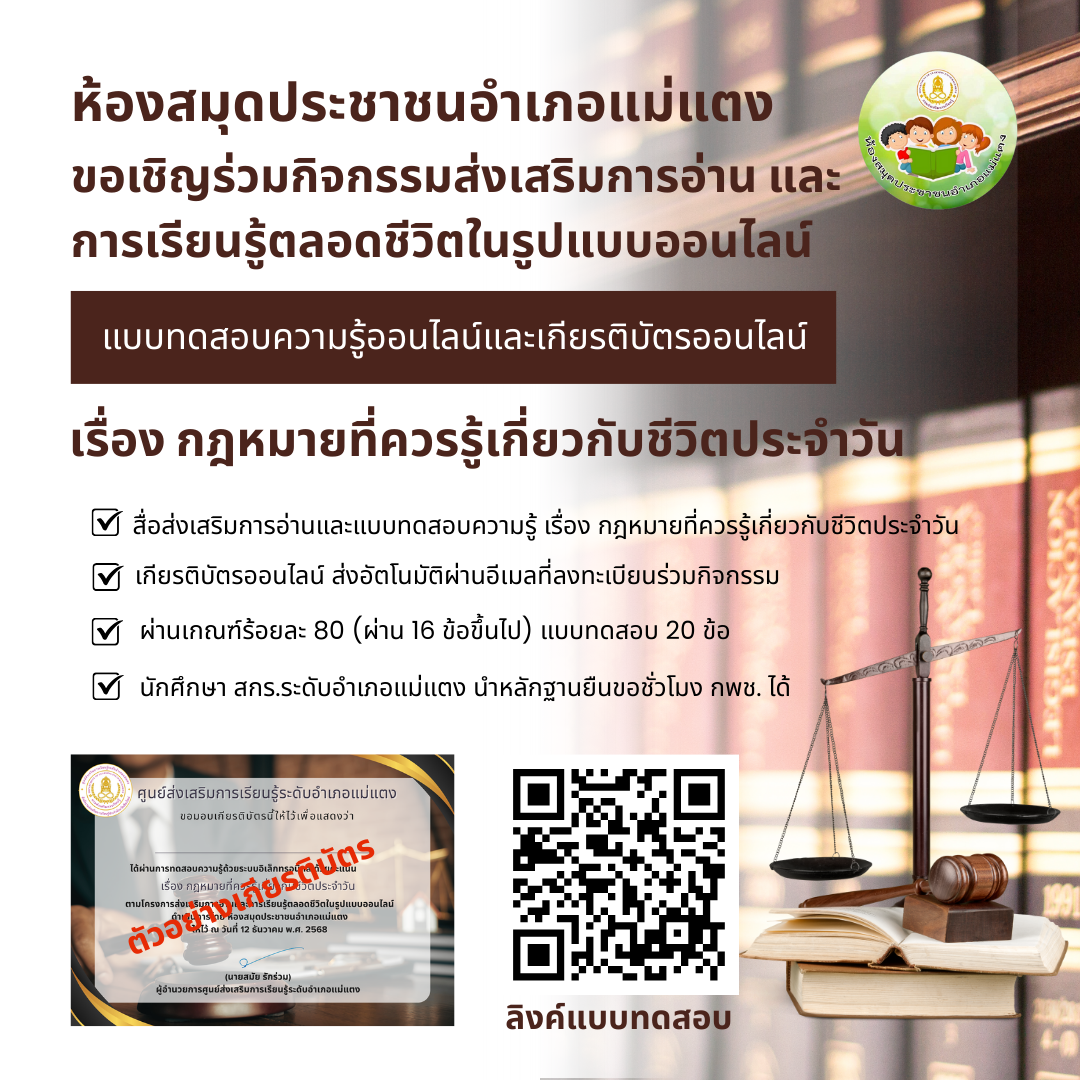 ห้องสมุดประชาชนอำเภอแม่แตง ขอเชิญชวนบุคลากรในสังกัด นักศึกษา สกร. เด็ก เยาวชน และประชาชนทั่วไป ร่วมกิจกรรมส่งเสริมการอ่านและการเรียนรู้ตลอดชีวิตในรูปแบบออนไลน์ แบบทดสอบความรู้ เรื่อง กฎหมายที่ควรรู้เกี่ยวกับชีวิตประจำวัน (ผ่านเกณฑ์ร้อยละ 80 หรือ 16 ข...